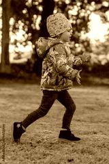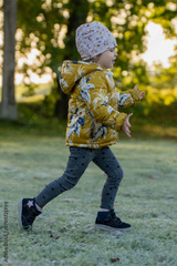 Little girl in yellow floral jacket and hat walking briskly on frosty grass field during chilly autumn morning, showing active movement, outdoor energy and early seasonal atmosphere
