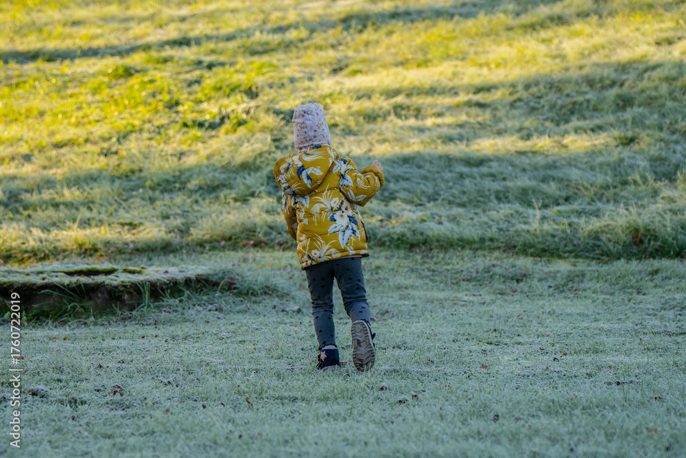 Little kid dressed warmly in colorful jacket walking away on frozen meadow, enjoying calm morning atmosphere, independence and connection with nature during autumn season