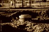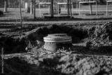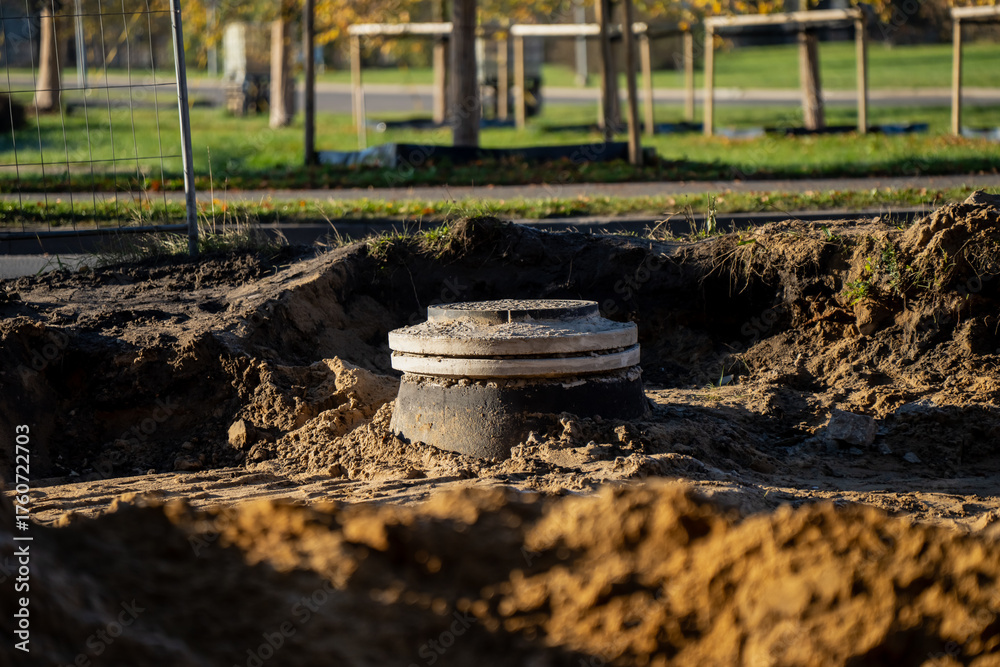Newly installed concrete sewer manhole at construction site surrounded by excavated soil, part of underground water and drainage infrastructure installation in urban area