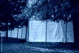 Temporary construction fence covered with white tarp standing among trees in green park area, securing worksite and protecting pedestrian zone during urban renovation process