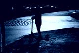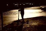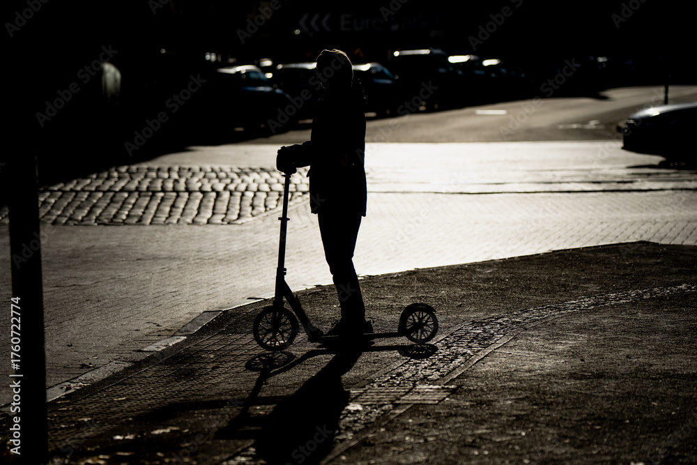 Silhouette of person standing with kick scooter on cobblestone street in low evening light, reflecting modern urban mobility and minimalistic transport lifestyle in city environment