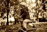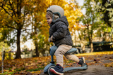 Toddler enjoying scooter ride on park path covered with colorful autumn leaves, symbolizing childhood freedom, curiosity and healthy outdoor lifestyle in natural family environment