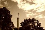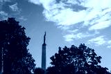 Freedom Monument in Riga rising above trees with autumn colors under blue sky, representing Latvian national pride, independence, and the enduring symbol of unity and resilience