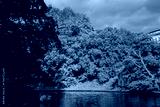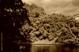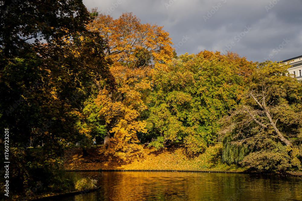 Golden autumn forest by city canal in Riga illuminated by sunlight, representing natural harmony, peaceful mood and vibrant seasonal landscape within Latvian urban green space