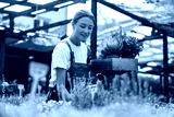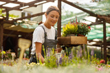 A joyful woman carries a beautiful wooden box filled to the brim with vibrant potted plants in a lively flower nursery