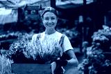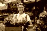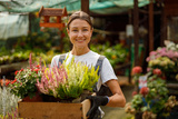 A cheerful and lively woman proudly showcases a stunning array of beautiful flowers at a bustling plant nursery