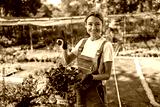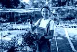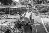 A cheerful gardener proudly showcasing vibrant and lively hanging plants in a beautifully maintained garden