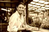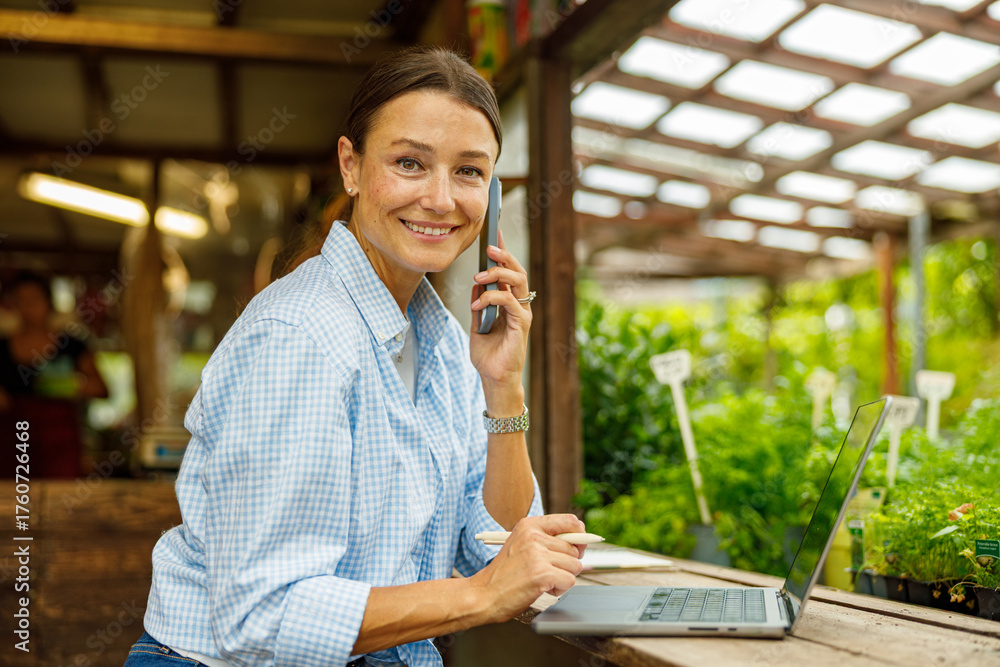 A woman makes a phone call and uses a laptop in a colorful greenhouse, blending work with natures beauty