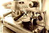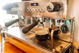 Experienced barista prepares freshly brewed coffee using professional coffee machine. In cozy coffee shop, espresso is poured from espresso machine into black cup. Small business, beverage concept.