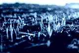A close-up of new green shoots emerging from fertile soil in the rays of the setting sun. Young plants emerge from the soil in an agricultural field. Gardening concept, bountiful harvest.