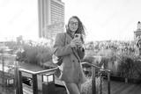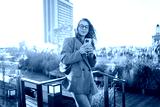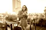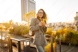 A smiling woman in glasses, standing on a rooftop terrace with her phone, enjoys the sunset. A beautiful woman poses outdoors. Concept of the city, fashion, and blogging.