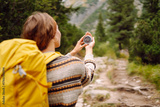 Female hiker with backpack holds compass on rocky hiking trail. Rear view of female looks at a compass and enjoys natural beauty of mountains. Travel and navigation concepts. Active lifestyle.