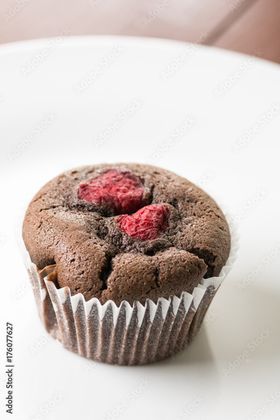 Chocolate cup cake muffin with raspberries isolated on the white plate