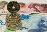 stack of krone coins on banknotes, norwegian money close up