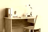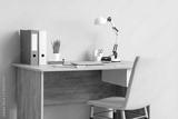 Modern workplace with desk lamp, houseplant, office supplies and chair near beige wall in room