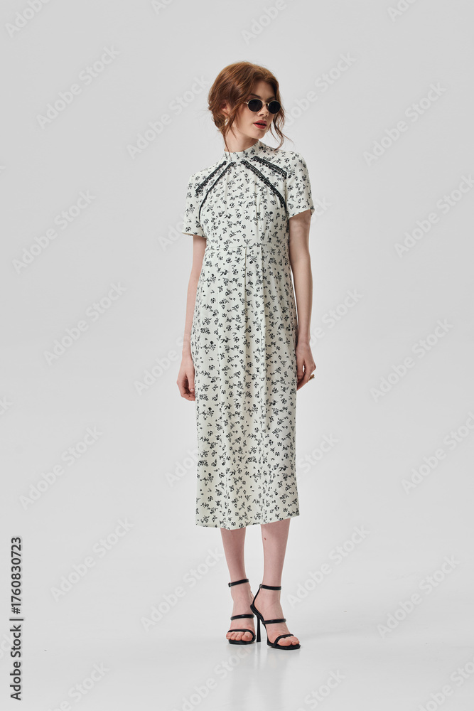 A girl model in stylish clothes poses on a gray background.