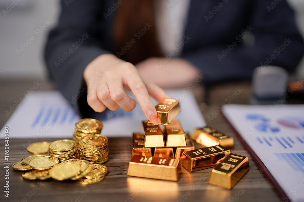 Adult Asian hand stacks gold bars with coins financial charts documents showing investment wealth management asset growth