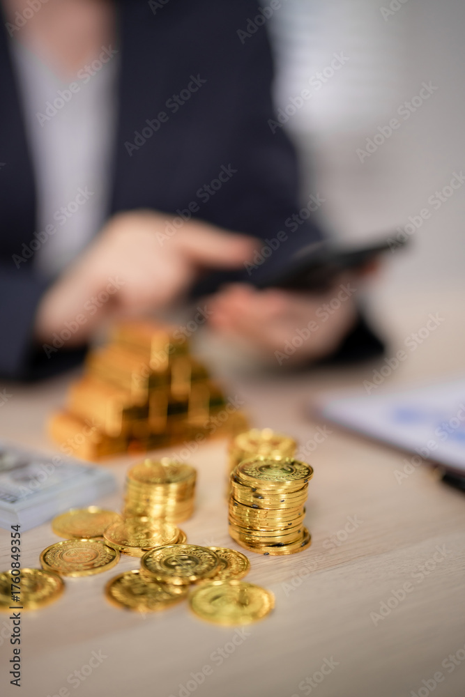 Professional hands use smartphone for gold investment trading and wealth management strategy amid gold coins bars and dollars on a financial table