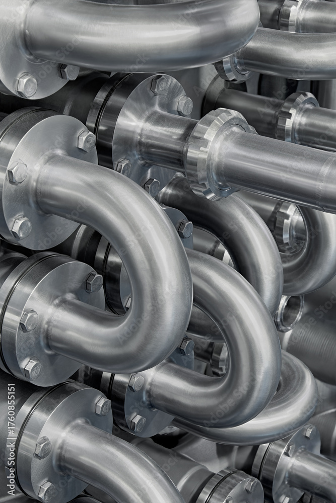 Curved stainless steel pipes, part of industrial cooling system
