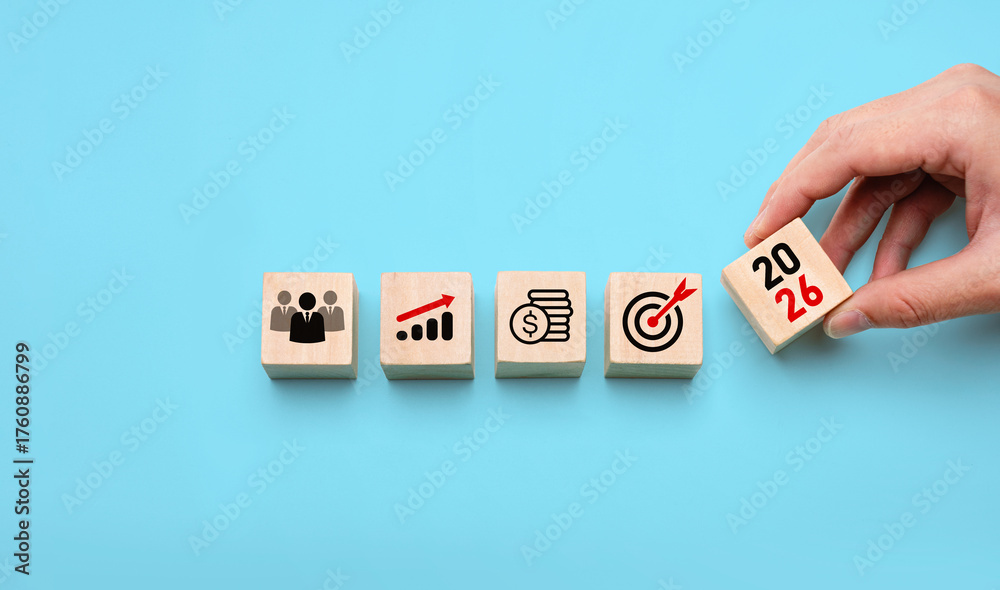 2026 business strategy planning concept with hand placing wooden blocks showing icons of team, growth, finance, and target, symbolizing future goals, leadership, development, and success planning