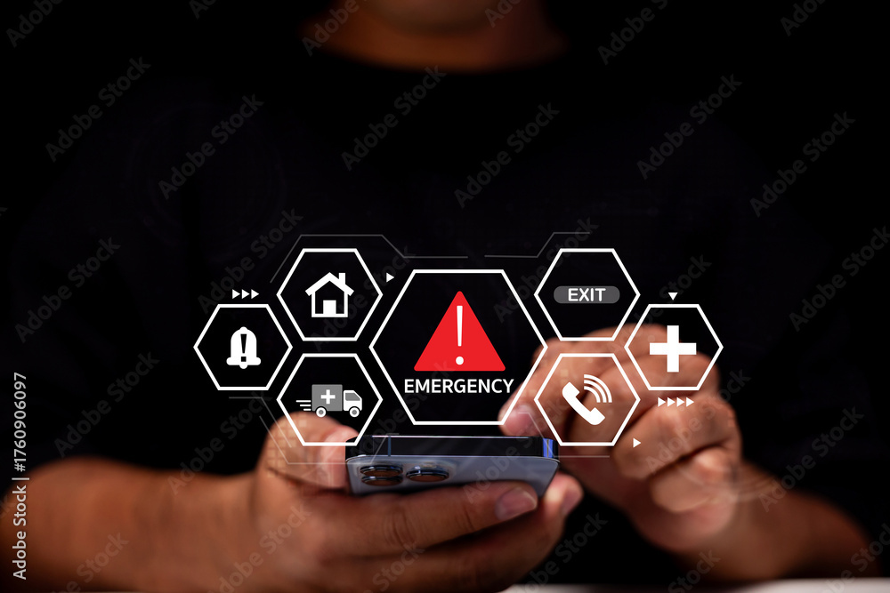 A person uses a smartphone to access an emergency interface, featuring icons for alerts, calls, and actions, highlighting the importance of immediate communication.