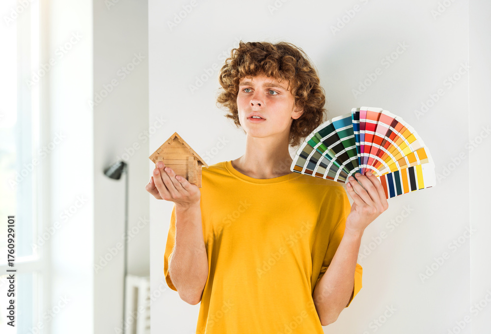 Young curly man choosing paint color using RAL palette in new apartment. Interior design and renovation concept with creative color selection for home decoration.