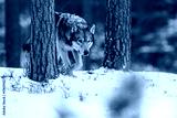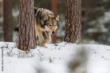 Grey wolf Canis lupus walking silently between trees in snowy forest