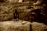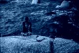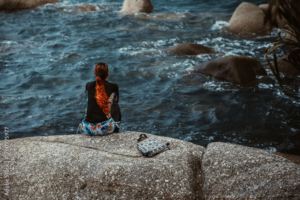 A girl sits on a rock in front of the sea during a storm. A girl with red hair. Clouds and rain.