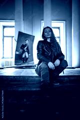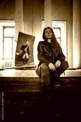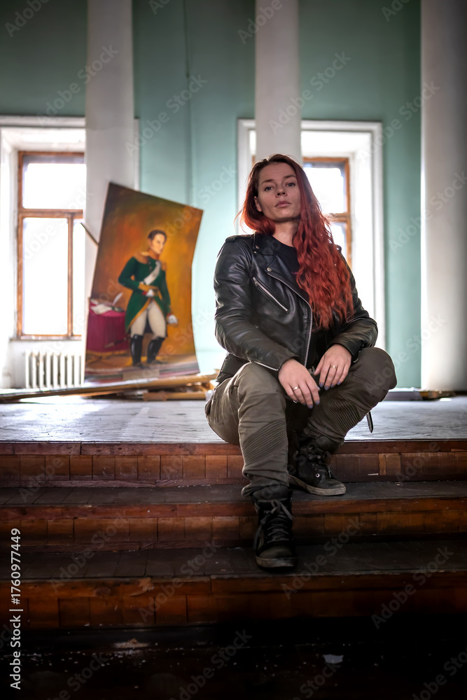 A girl sits in an abandoned palace. A girl with red hair. An old abandoned palace.