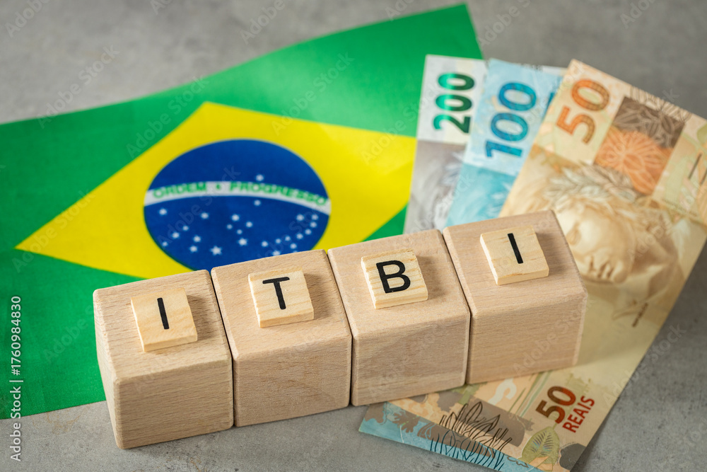 ITBI in Brazil. An abbreviation for property purchase tax. A financial and business concept. ITBI symbol on wooden blocks, Brazilian flag, and reais money