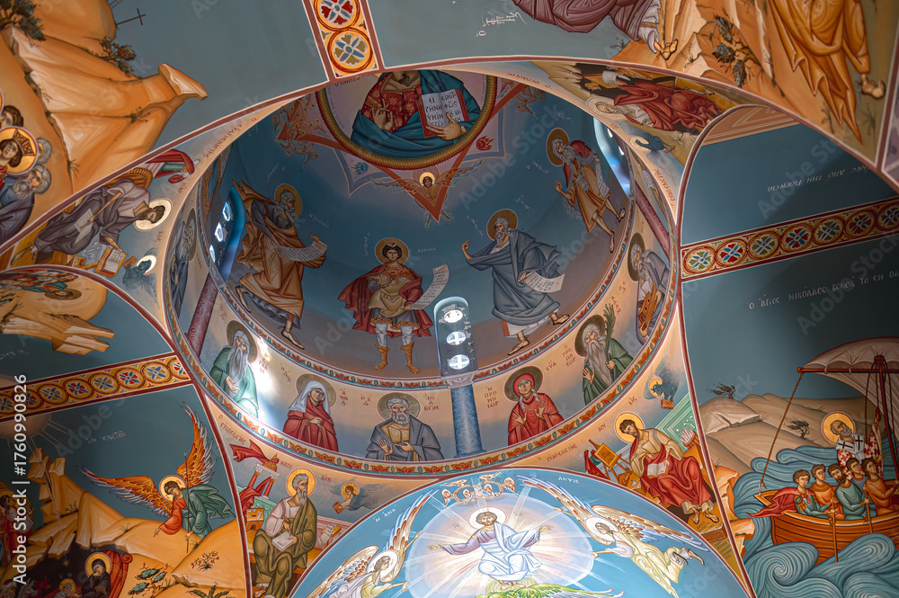 Colorful frescoes depicting religious scenes decorating the ceiling of a Agios Nikolaos Church in Paralimni, Cyprus