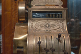 Old ornate brass cash register showing amount due