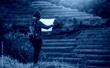 Young women backpacker looking to the map on rice fields terraced in Mu Cang Chai, YenBai, Vietnam.