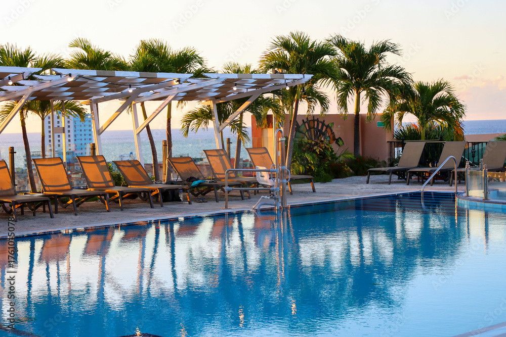 Rooftop Poolside Relaxation with Palm Trees and Ocean View