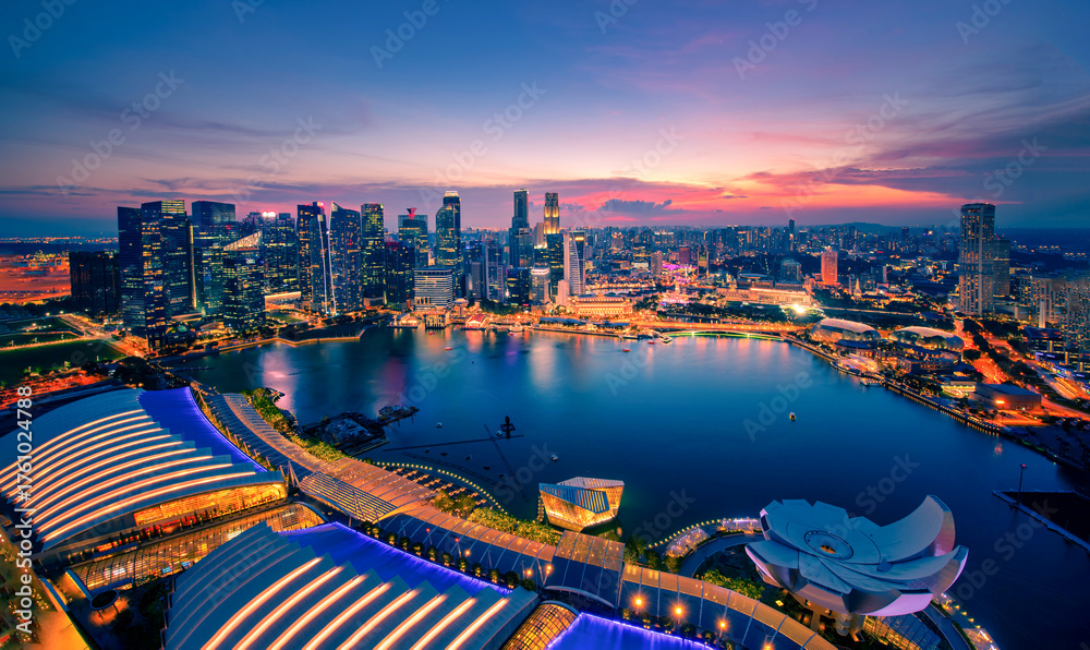 Singapore Skyline and view of skyscrapers on Marina Bay at sunset.