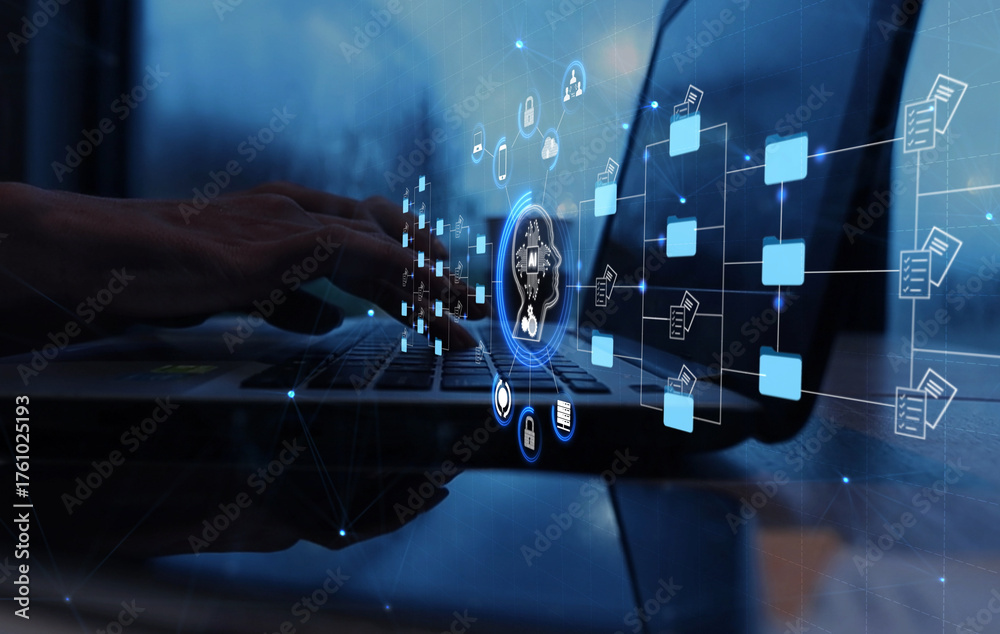 Ai,Document management system DMS, Enterprise content management, Businessman working on laptop computer with digital document, managing files data, paperless workflow, data search, cloud technology