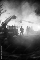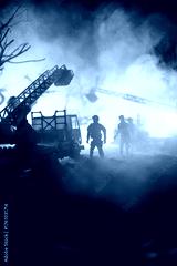 A tabletop diorama of a tragic California wildfire, set in Pacific Palisades near Malibu. Dramatic flames and smoke rise as firefighters battle the blaze