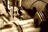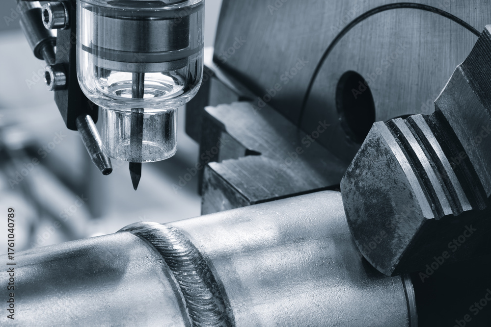 Close-up of modern industrial welding machine with fixed pipe with weld seam, industrial concept background