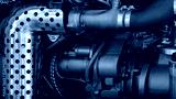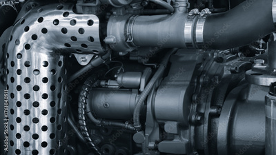 A close up of a car engine with a lot of detail. The engine is black and silver