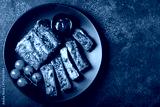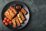 Hot grilled spare ribs from a summer BBQ served on a plate with sauce. Top view. Copy space