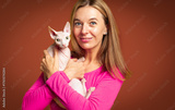 A woman in a pink top gazes joyfully while holding a sphynx cat in her arms. The warm background adds to the affectionate atmosphere of the moment, showcasing their bond