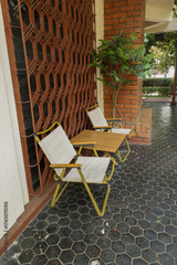 Colorful folding camping chair,wooden and chair set in garden on a sunny day,outdoor seating for restaurant or cafe.