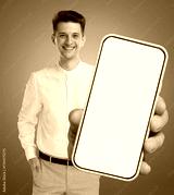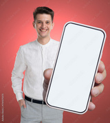 A cheerful young man stands against a lively red backdrop, proudly displaying a blank smartphone in his hand. His bright smile adds a warm touch to this modern scene