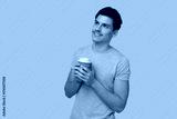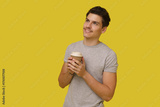 A young man smiles while holding a takeaway coffee cup against a vibrant yellow background