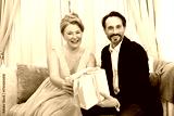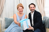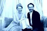 A woman in a blue dress smiles with delight as a man presents her with a wrapped gift. The couple sits on a couch in a well-appointed living room, enjoying a moment of shared joy and anticipation