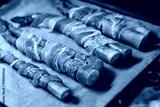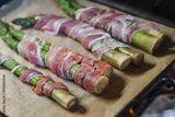 Close-up view of asparagus wrapped in bacon ready for baking. Low DOF. Selective focus.
