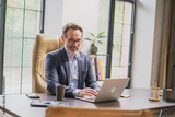 A dedicated professional man enjoys a productive workday at his stylish office desk, fully engaged with his laptop, exuding joy and concentration during his tasks