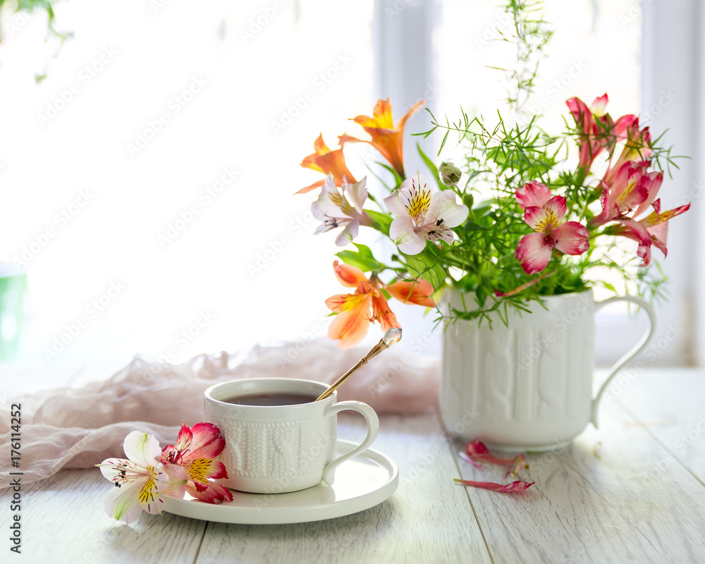 White cup with tea on the table. Flowers nearby