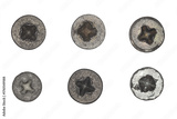 Used screw and bolt heads with signs of wear, scratches, dents, rust spots. Close-up view. Isolated on transparent background. Set 6.