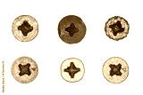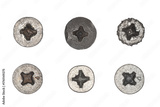 Used screw and bolt heads with signs of wear, scratches, dents, rust spots. Close-up view. Isolated on transparent background. Set 4.